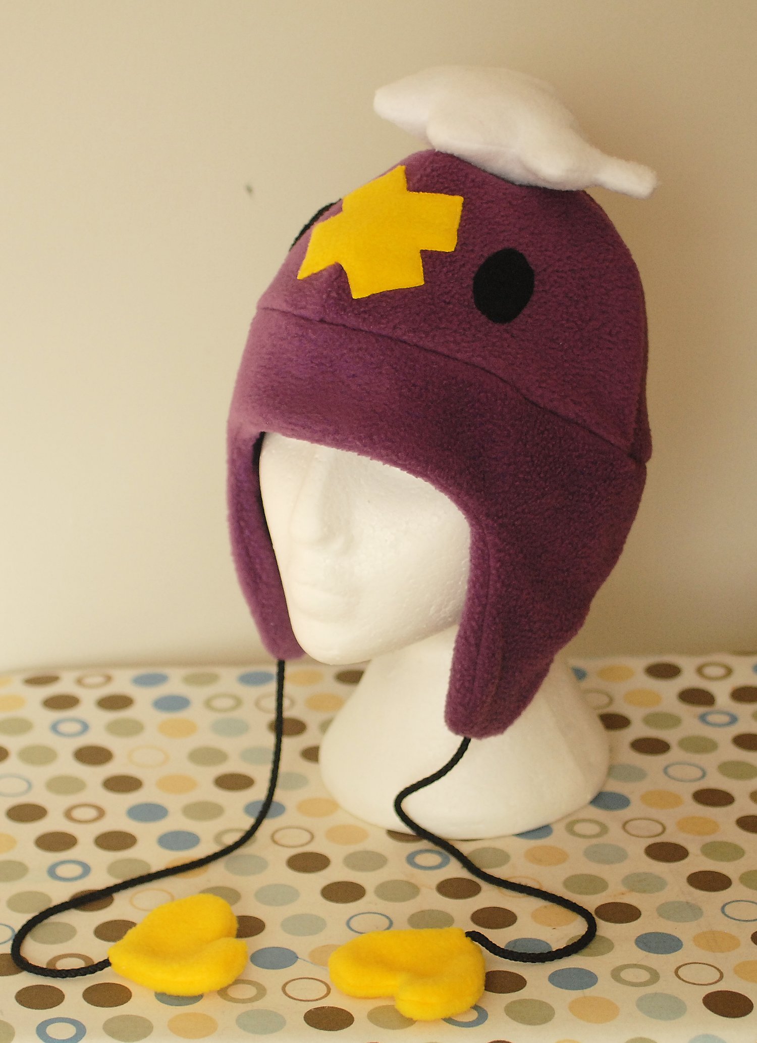This handmade hat is made of polyester fleece. It measures about 24 inches around, but will stretch to fit larger heads.